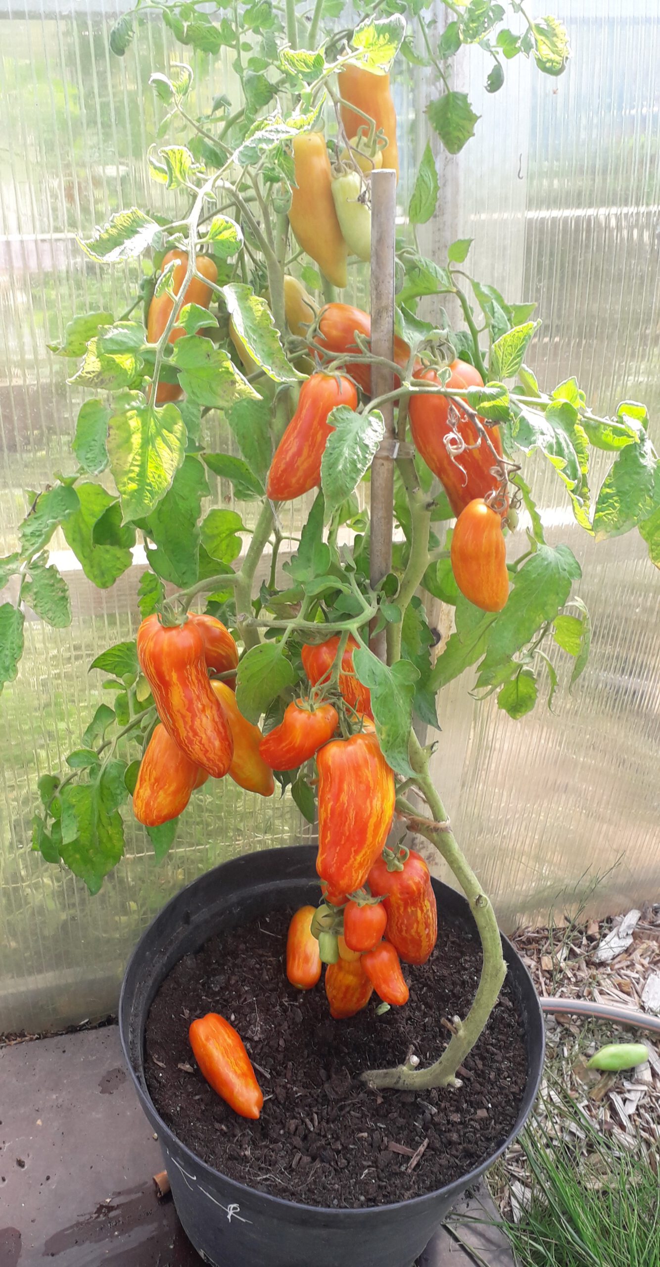 Pomidorai labai gažūs, raudoni su ryškiai geltonais dryžiais, savo forma primena nedideles pailgas paprikas.